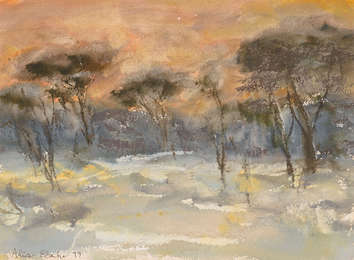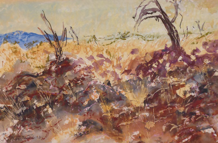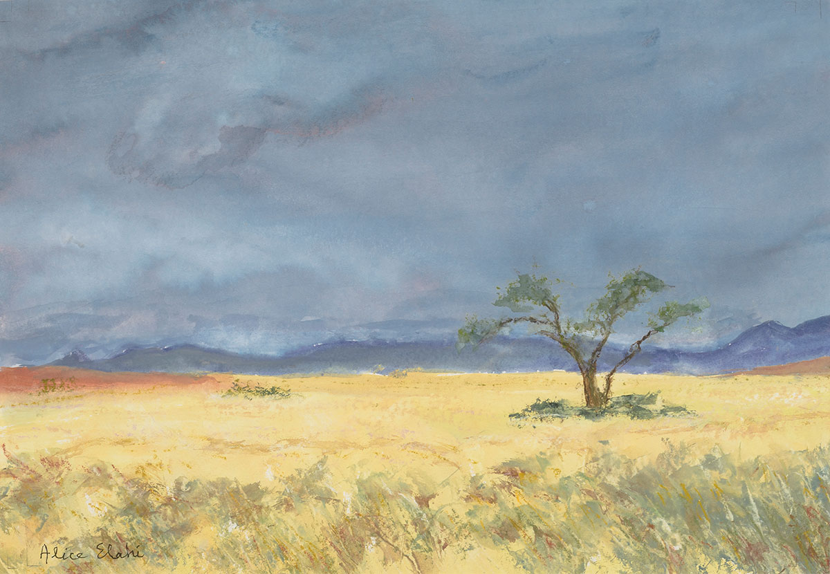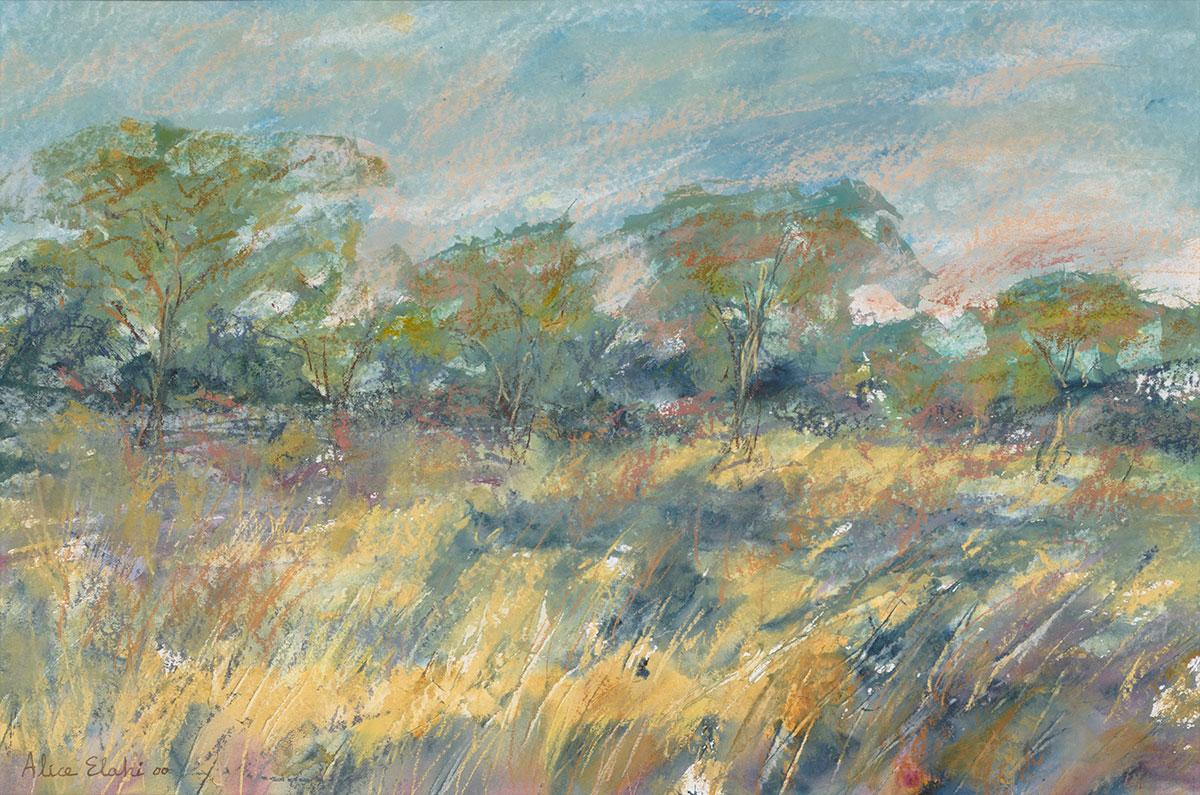 The wilderness areas of Namibia and its Skeleton Coast were the focus of her painting trips for over two decades, but she also did frequent trips into the African Bushveld and the Cape Coast.
